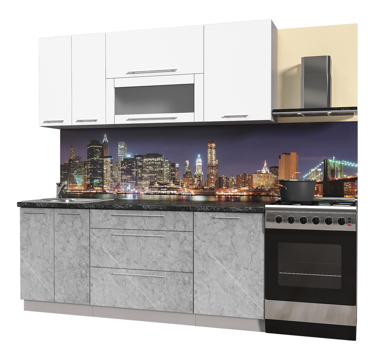- Цвет фасадов (верх-низ) - Белый глянец - Мрамор матовый (кромка ПВХ, цвет Алюминий)
