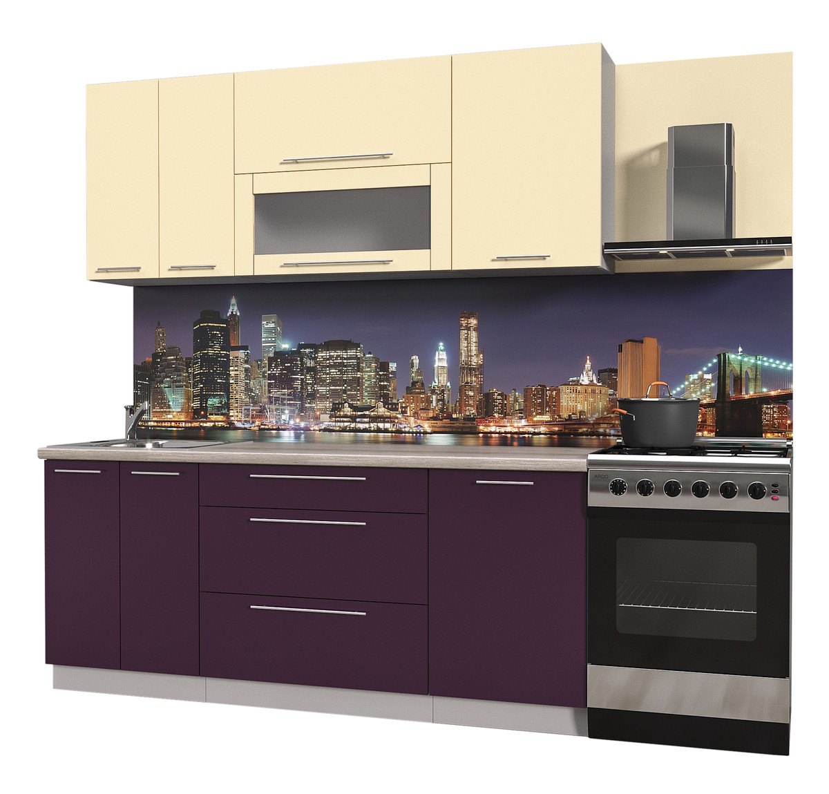 - Цвет фасадов (верх-низ) - Ваниль глянец - Слива глянец (кромка ПВХ, цвет Алюминий)